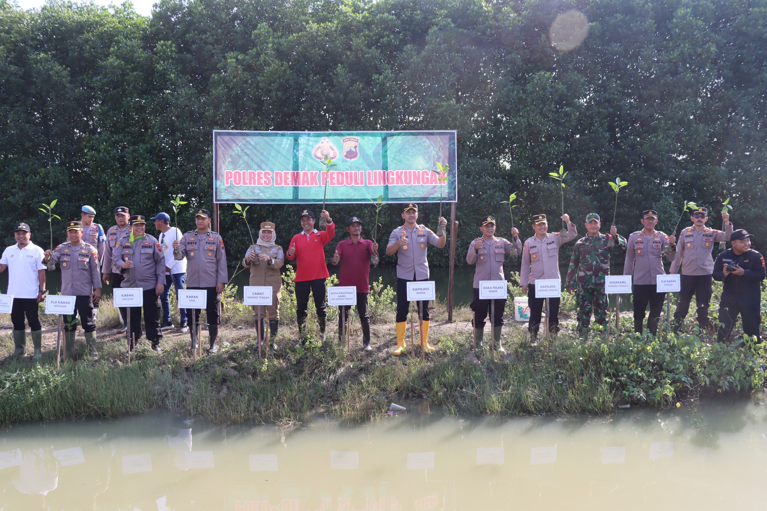 DEMAK I Penanaman mangrove yang digelar Polres Demak di Pantai Glagah Wangi, Desa Tambakbulusan, Senin (12/5/2024).