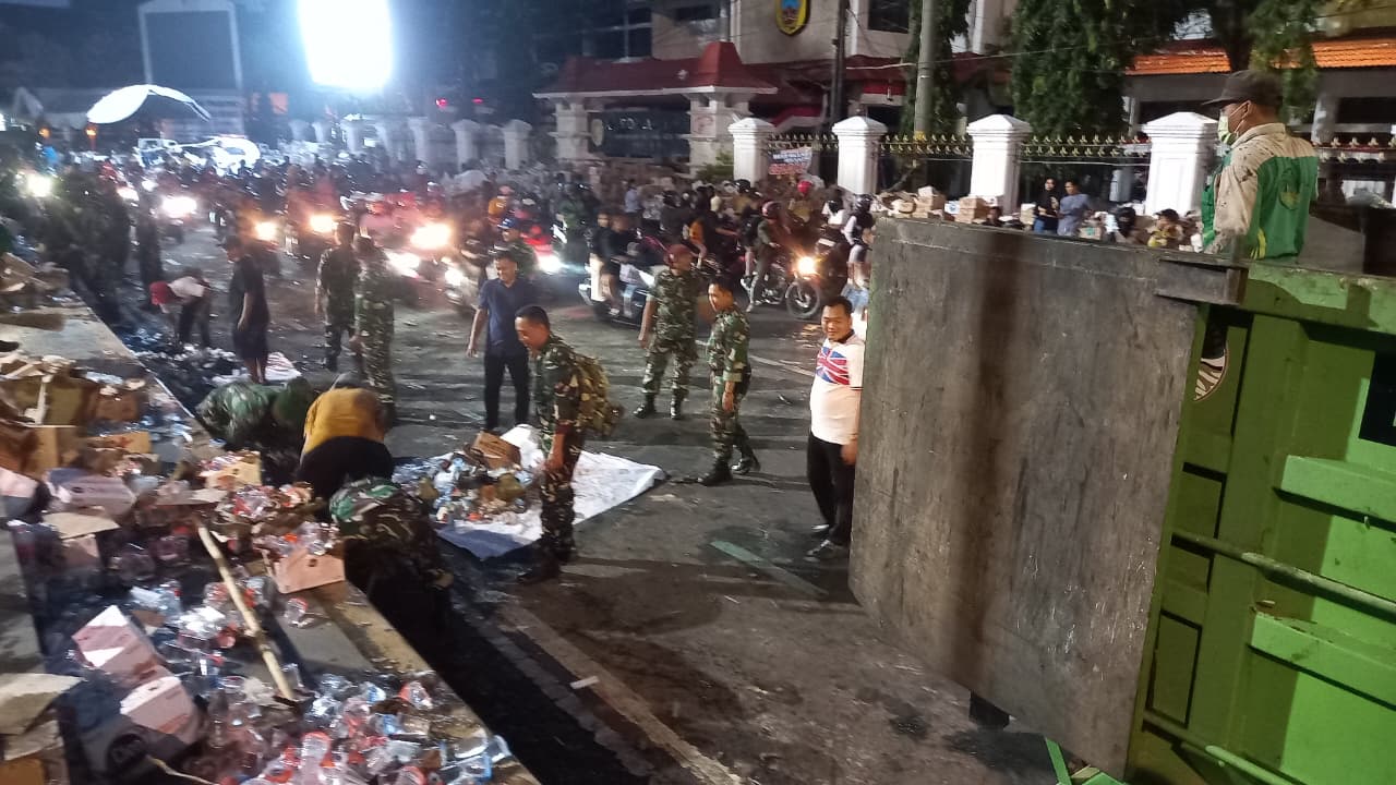 Prajurit TNI turun langsung membawa sapu, sekop, dan karung mengumpulkan sisa spanduk, plastik, hingga material yang berserakan.