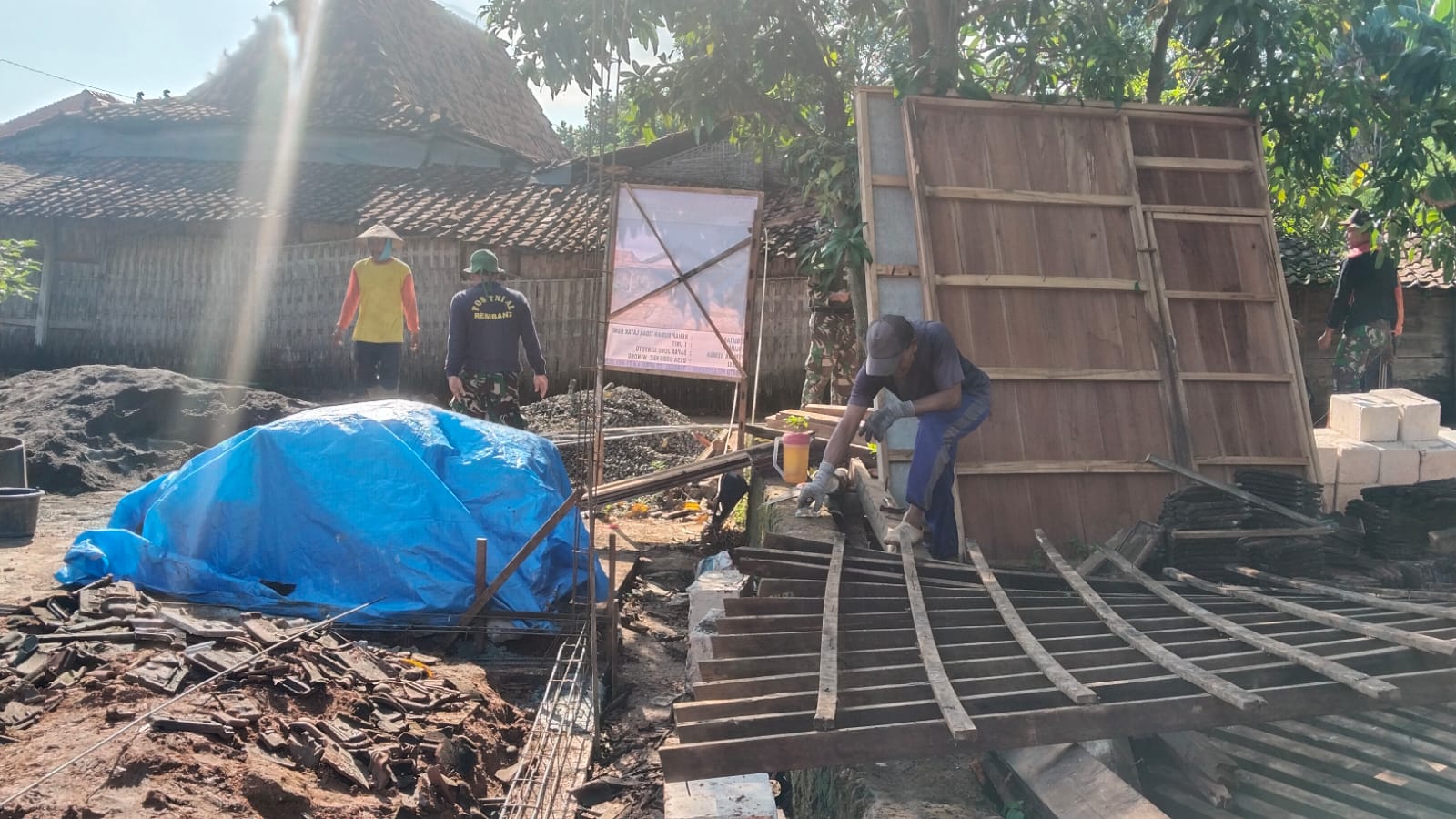 Pengerjaan renovasi dilakukan secara menyeluruh. bagian rumah yang rusak dibongkar, struktur diperkuat, atap diganti, dinding dibangun kembali, serta lantai dipasang agar rumah lebih kokoh dan sehat.